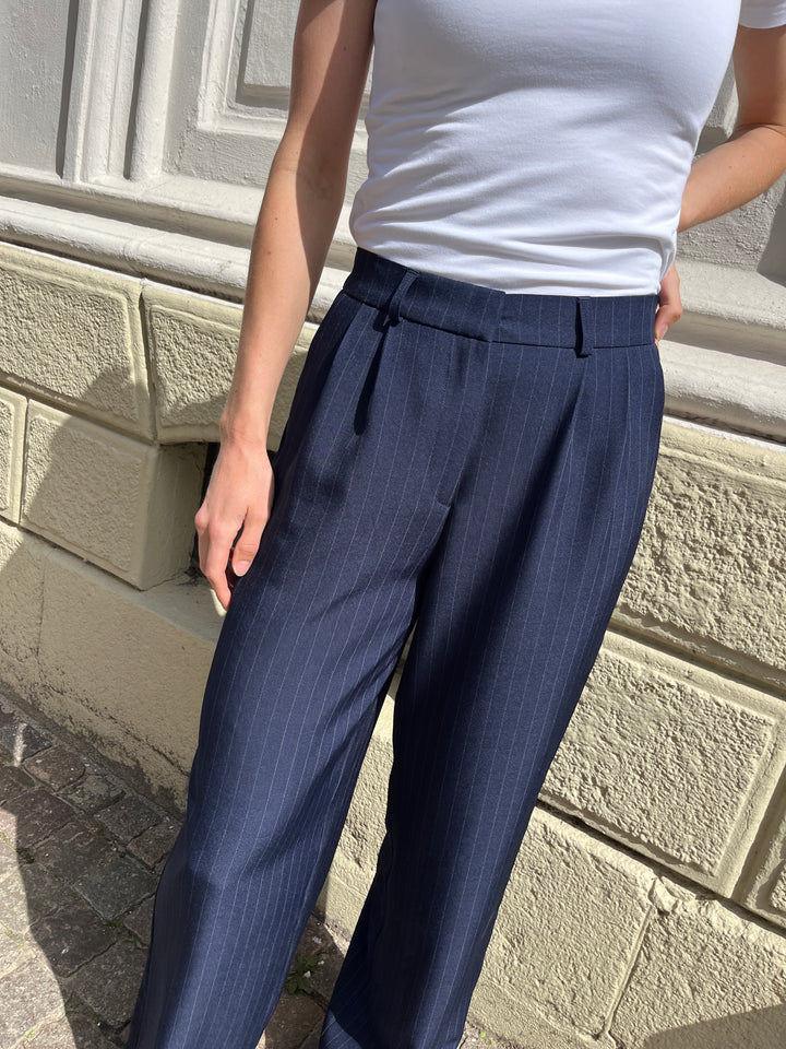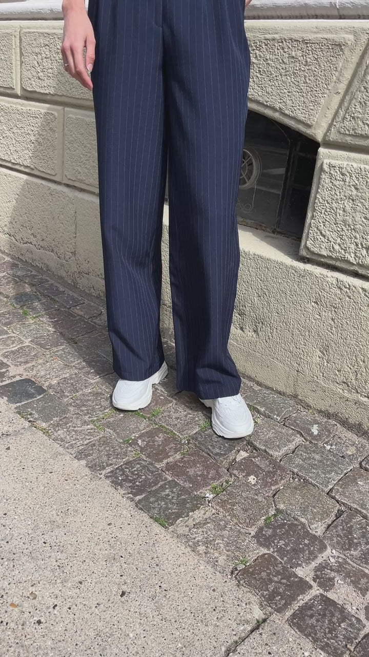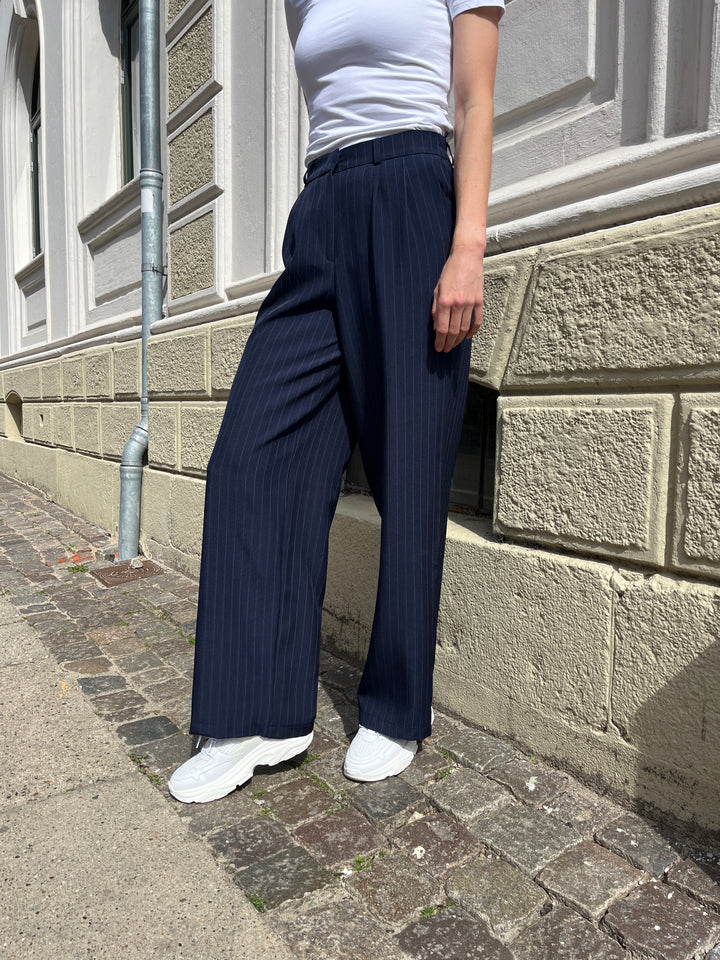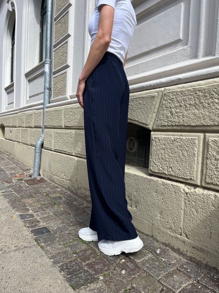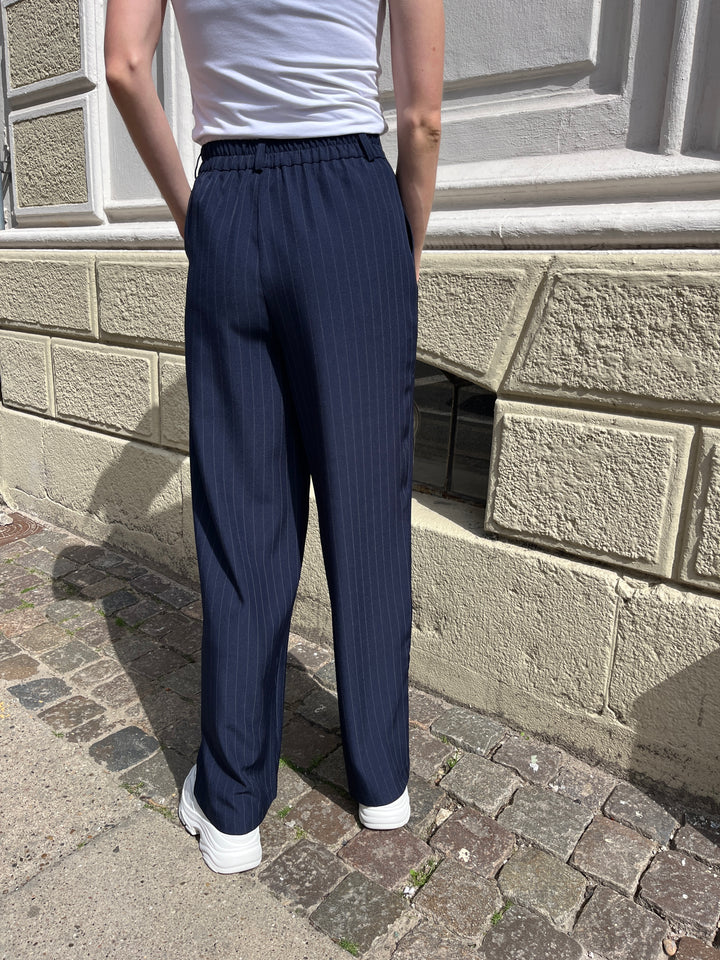 Med Merel pants i blå får du de skønneste bukser i løs pasform med elastik bagerst. Bukserne er lavet i en fast glat kvalitet med hvide nålestribede detaljer. Opnå et tidsløst og klassisk udtryk med eksklusive detaljer! Modellen er 186cm høj, iført størrelse S. Bukserne er en del af LW Limited som eksklusivt er tilgængelig hos os og findes i begrænset antal!