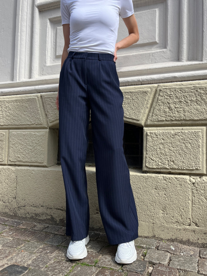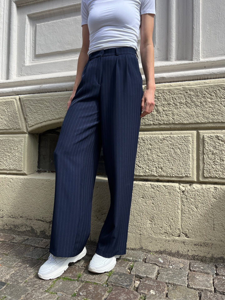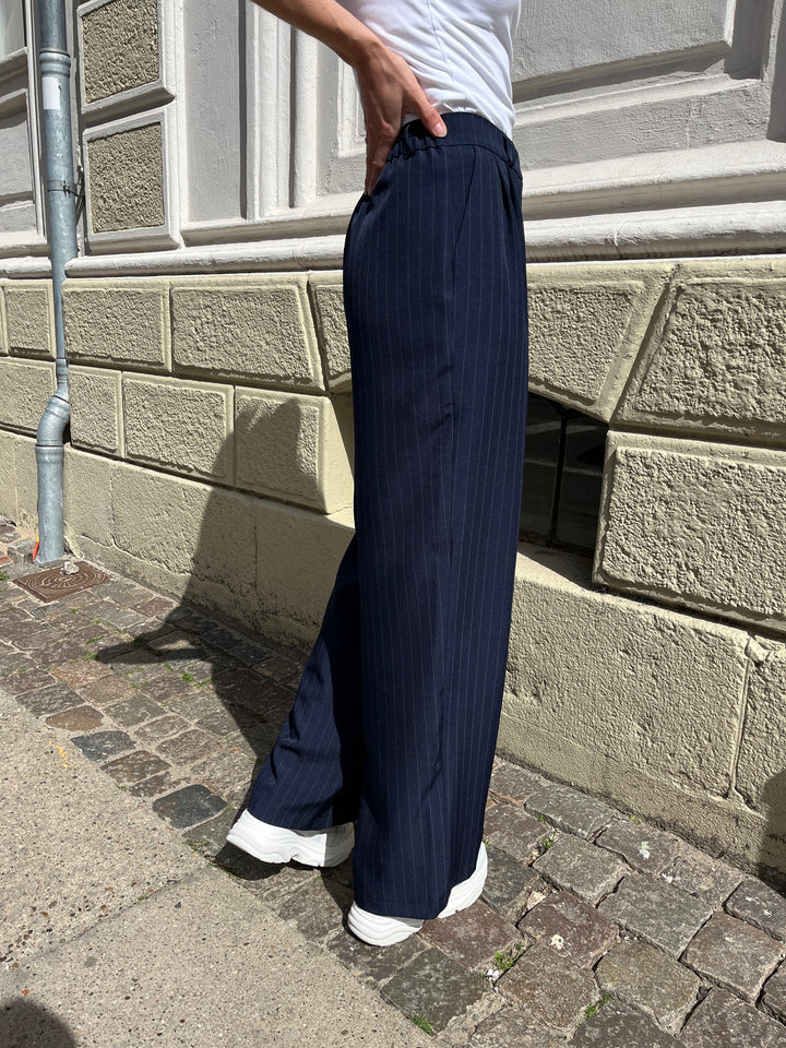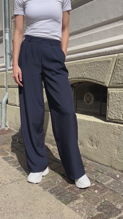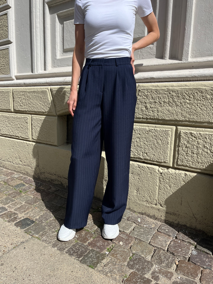 Med Merel pants i blå får du de skønneste bukser i løs pasform med elastik bagerst. Bukserne er lavet i en fast glat kvalitet med hvide nålestribede detaljer. Opnå et tidsløst og klassisk udtryk med eksklusive detaljer! Modellen er 186cm høj, iført størrelse S. Bukserne er en del af LW Limited som eksklusivt er tilgængelig hos os og findes i begrænset antal!