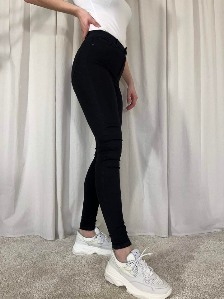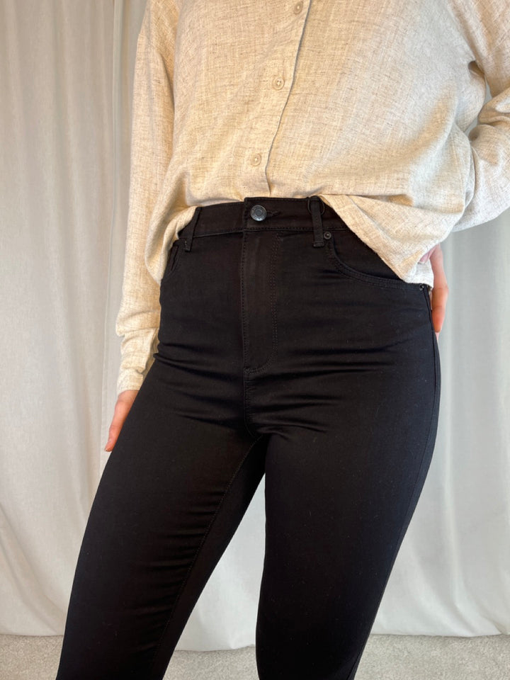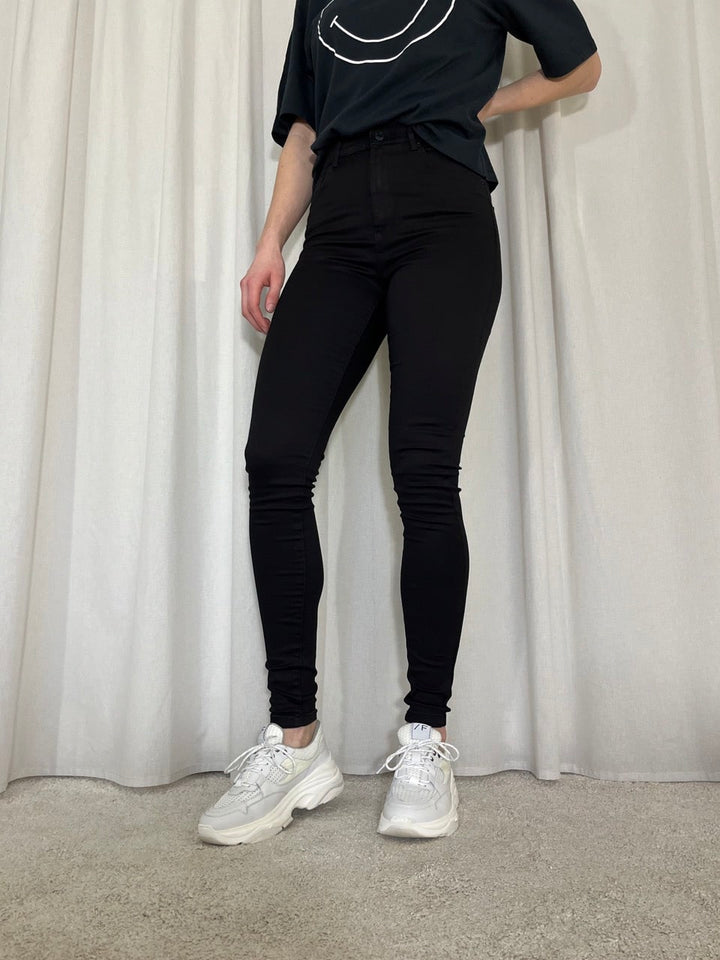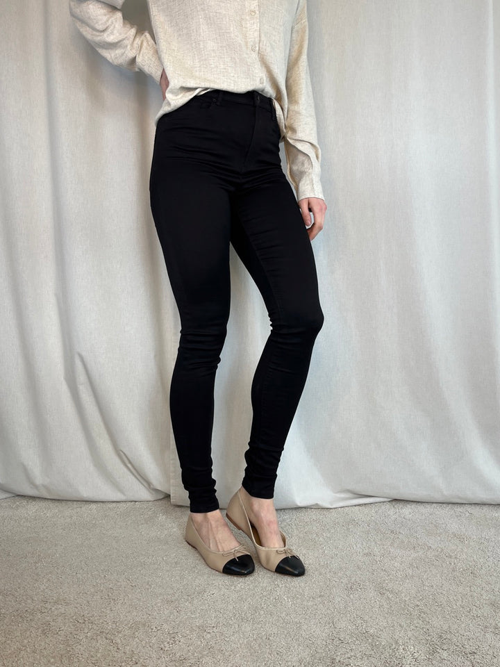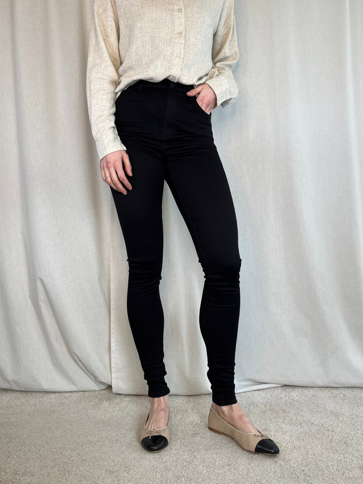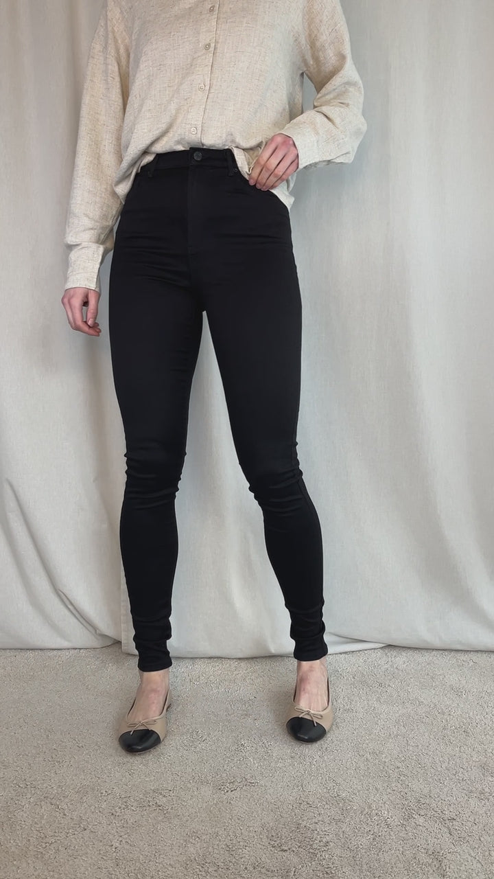 Med disse jeans får du et par lækre slimfit jeans med høj talje i sort denim med bæltestropper, lynlås og knaplukning. En helt enkel og god klassisk style, som sidder godt og som er et musthave i en basisgarderobe. Der er en smule stræk i, hvilket gør dem ekstra behagelige at bruge.