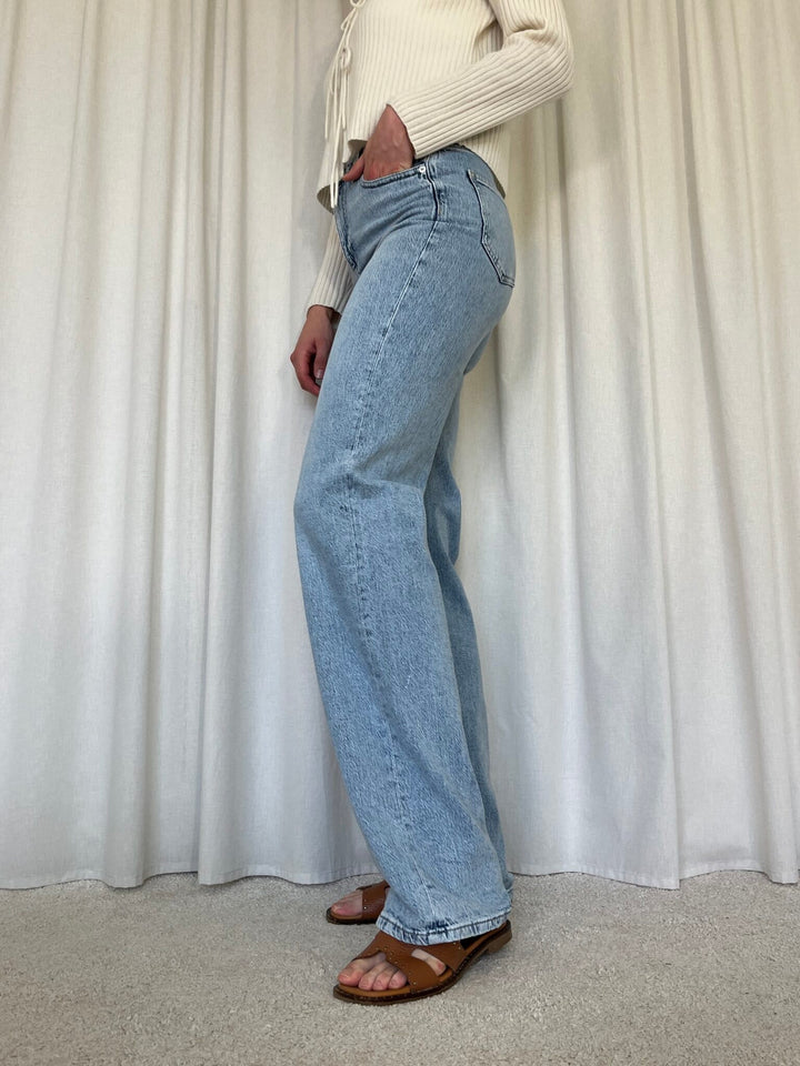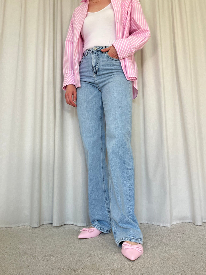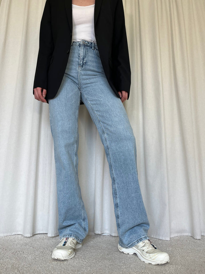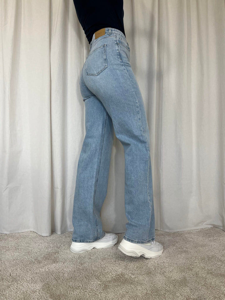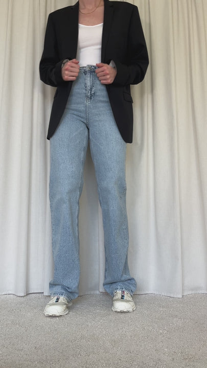 Straight jeans er lavet i en smuk lys blå denimfarve med høj talje og bæltestropper. De lukkes med lynlås og knap og har lommer både for og bag. Modellen er lavet i et straight/wide snit der gør, at de sidder til omkring bagdelen og løs pasform ved benene. Disse jeans er super cool at style til både stiletter samt sneakers og deres faste pasform gør, at de bliver siddende, hvor de skal.