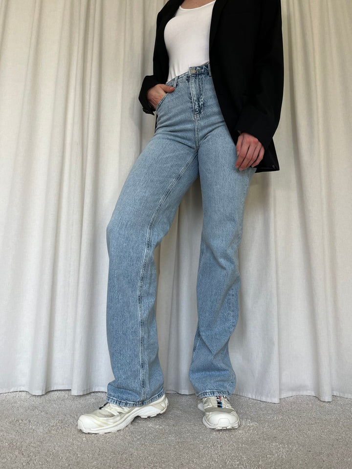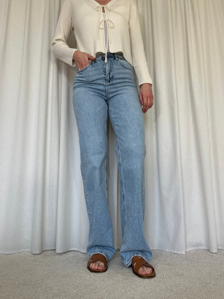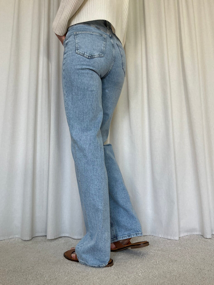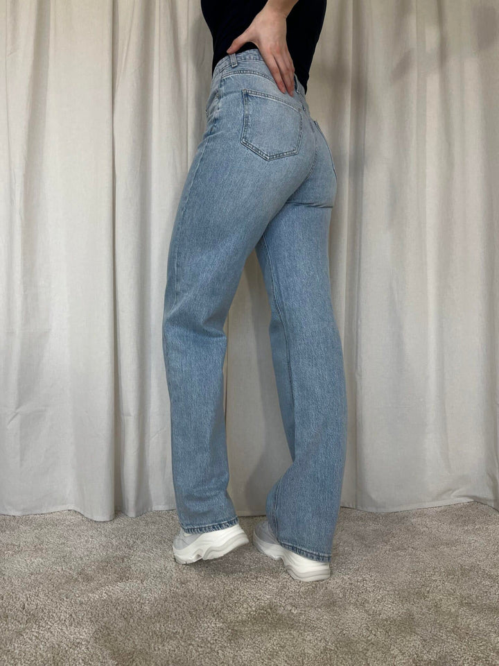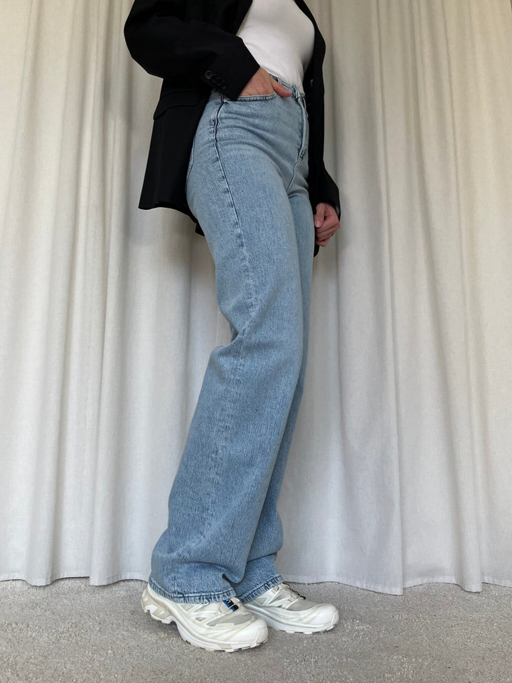 Straight jeans er lavet i en smuk lys blå denimfarve med høj talje og bæltestropper. De lukkes med lynlås og knap og har lommer både for og bag. Modellen er lavet i et straight/wide snit der gør, at de sidder til omkring bagdelen og løs pasform ved benene. Disse jeans er super cool at style til både stiletter samt sneakers og deres faste pasform gør, at de bliver siddende, hvor de skal.