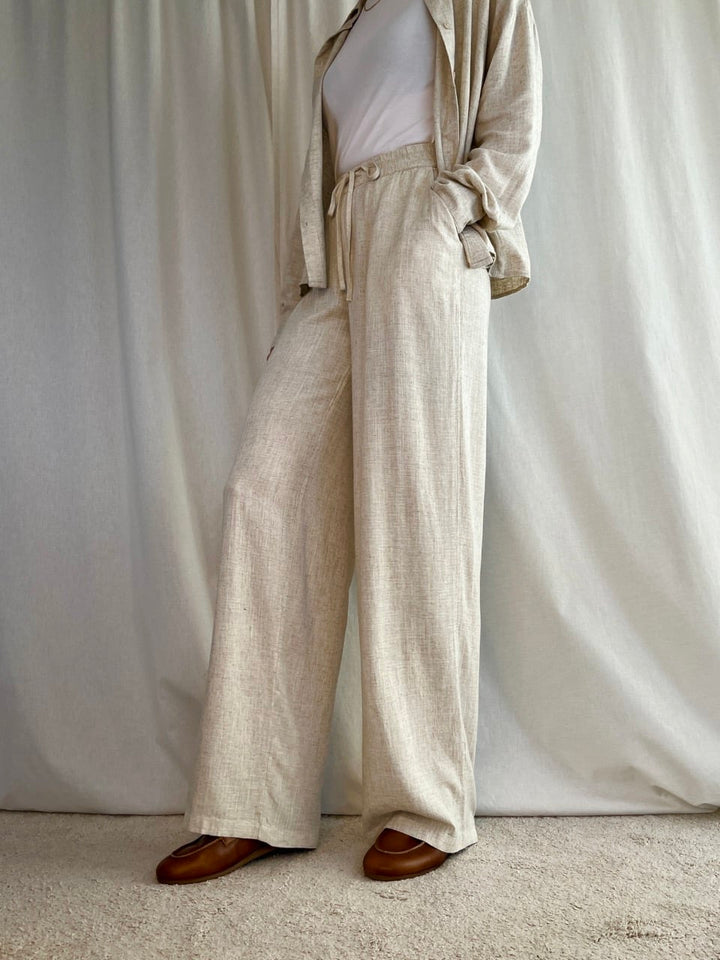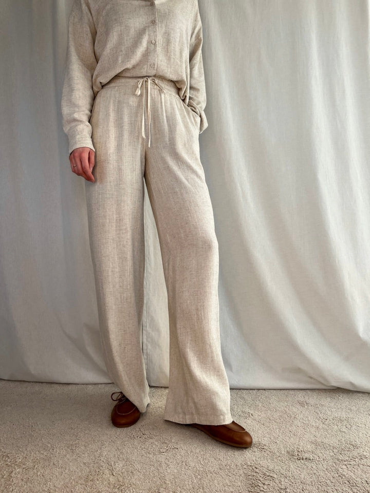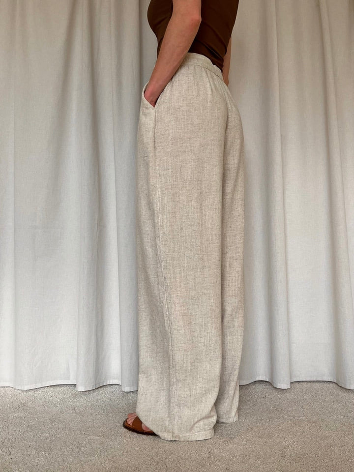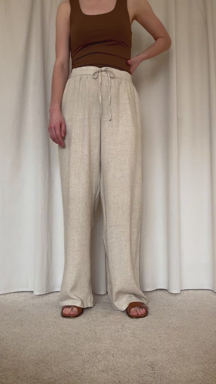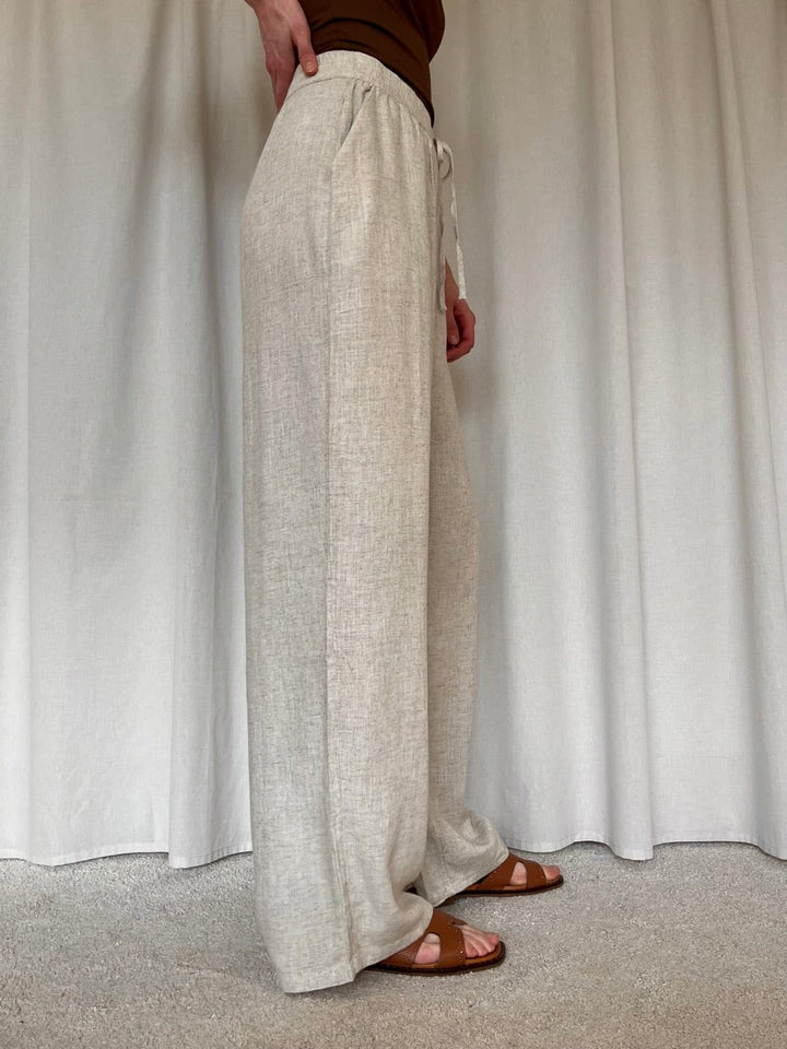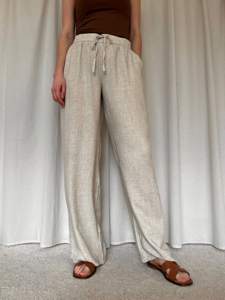 Med disse skønne bukser får du ikke bare et par behagelige og flotte bukser, du får også et par bukser lavet i de lækreste materialer, nemlig hør og viskose, som giver den blødeste kvalitet. Bukserne er lavet med almindelig taljehøje og kan trækkes lidt op eller ned, alt efter hvordan man ønsker de skal sidde. Der er elastikkant og bindebånd i taljen og lommer foran.