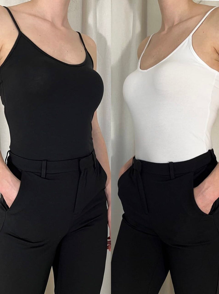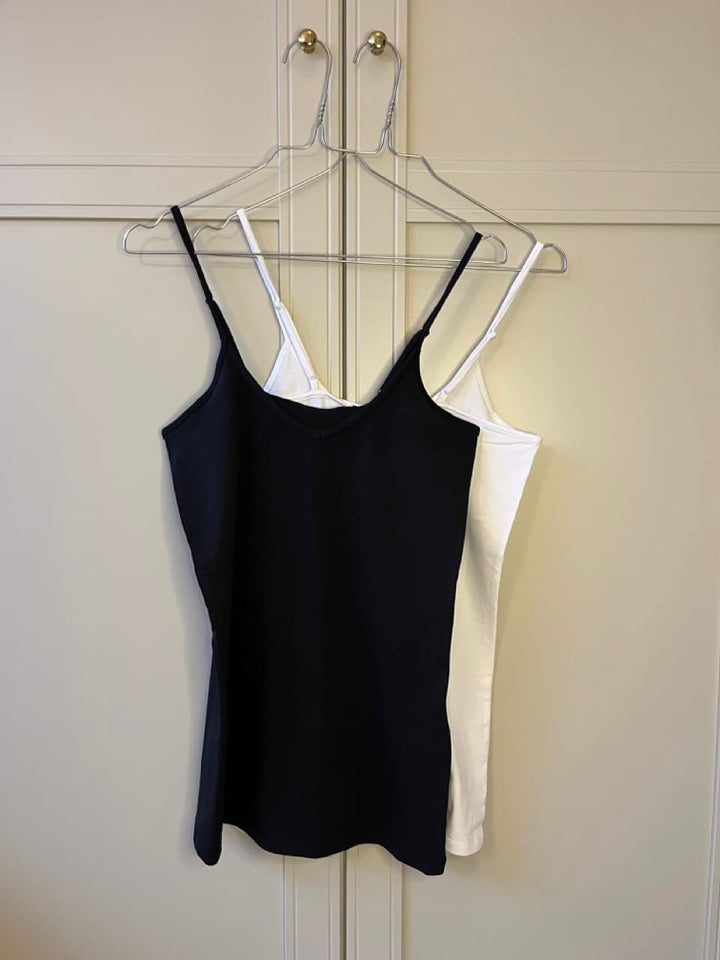 Med denne fine 2-pak, får du to super lækre basistoppe i blødt bomuld. Pakken indeholder 1 stk. hvid og 1 stk. sort. Toppene er lavet med smalle stropper som kan reguleres i længden. De er også lavet med en smule ekstra længde på, så de sidder helt perfekt på os høje kvinder. Toppene er de perfekte basistoppe til at bruge indenunder skjorter, bluser m.m. og til sommermånederne er de skønne at bruge til et par af vores løse hørbukser eller lign.